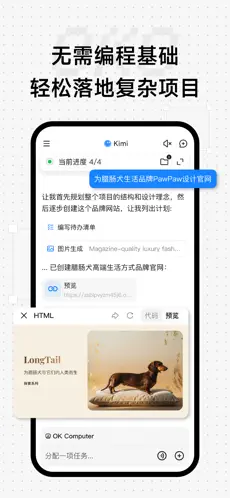 Kimi K2 已开启长思考模式,K2是基于 MoE 架构的万亿参数模型,代码、搜索、文本创作、通用知识推理表现全面提升,速度更快,回答无需等待,专为解决复杂任务而生,现已开源 只需一句话,Kimi就能将你的想法变成专业PPT。从内容大纲到视觉设计,让你的灵感清晰可见 可在应用内直接编程、创作、数据分析,生成PPT,还支持调用多种工具,高效解决复杂任务,成为你的随身Agent助理,只需一句话,即可获得可视化的结果。 ——此外,写作也更具细节与想象力,懂你的梗、接得住话、还会抛梗 无论你是程序员、科研人员、学生,还是互联网与法律行业的从业者,以及对AI好奇的所有人,Kimi旨在增强每一位专业人士与学习者的能力,让你从繁重的资料处理和内容创作中解放出来。 如果在使用过程中遇到任何问题,可在Kimi应用内“设置-点击头像-意见反馈”进行反馈。Kimi会珍视每一条宝贵建议,不断学习进步,给出更好的答案~